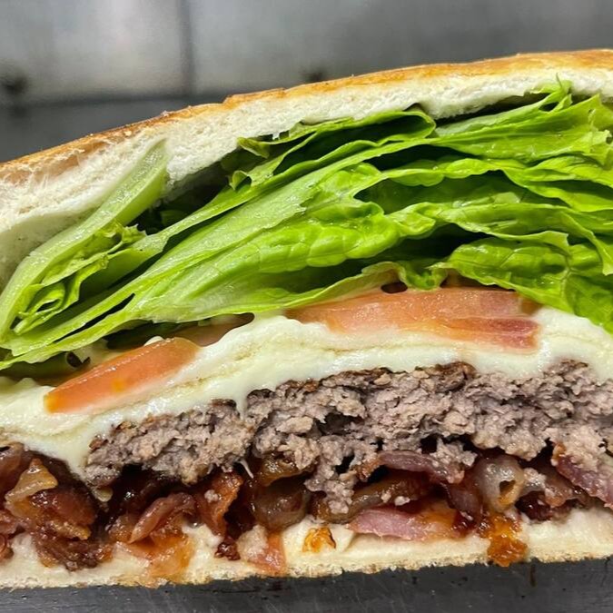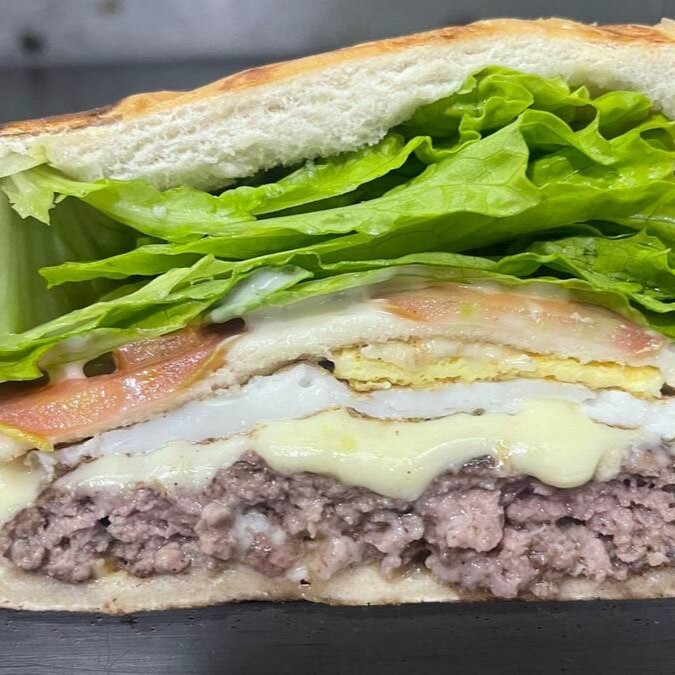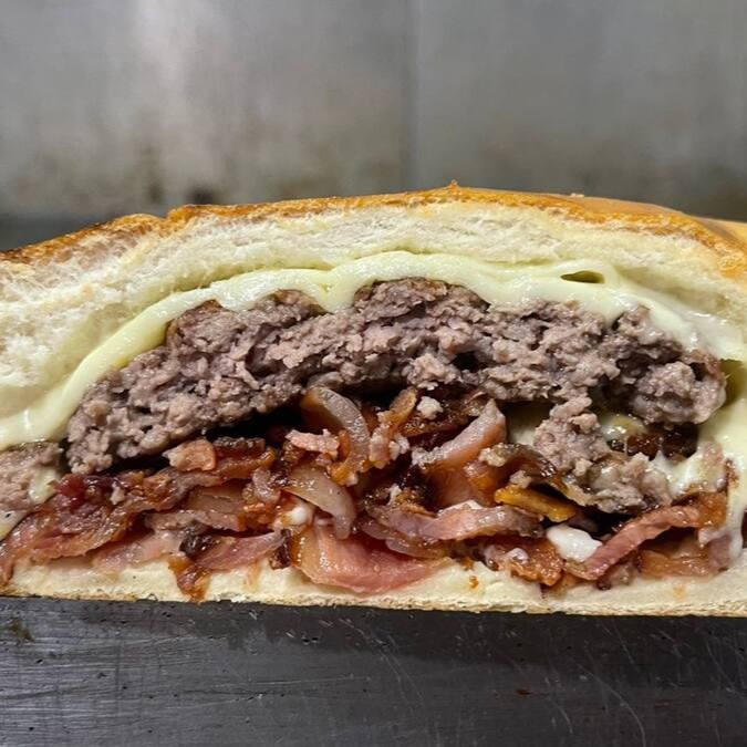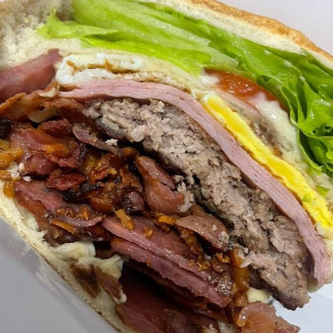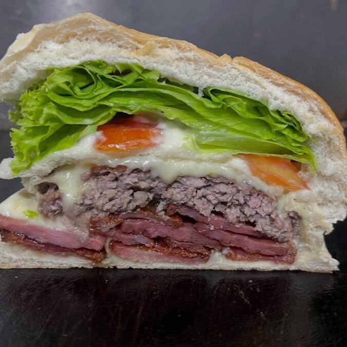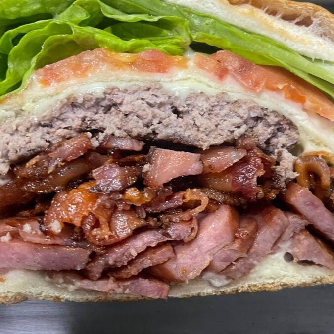 Pão,maionese,Hambúrguer, queijo, calabresa, bacon, presunto, ovo, alface e tomate