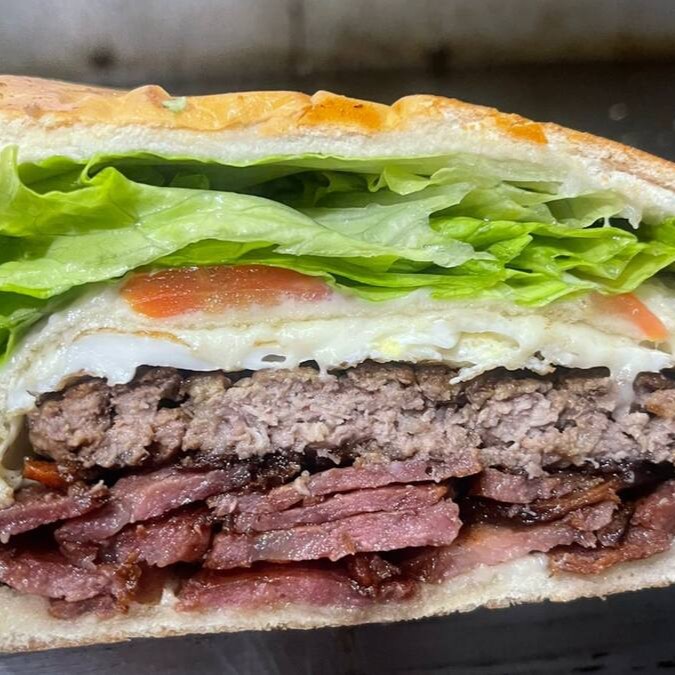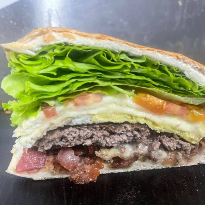 Pão , maionese, hambúrguer , queijo , calabresa , ovo , bacon , alface e tomate
