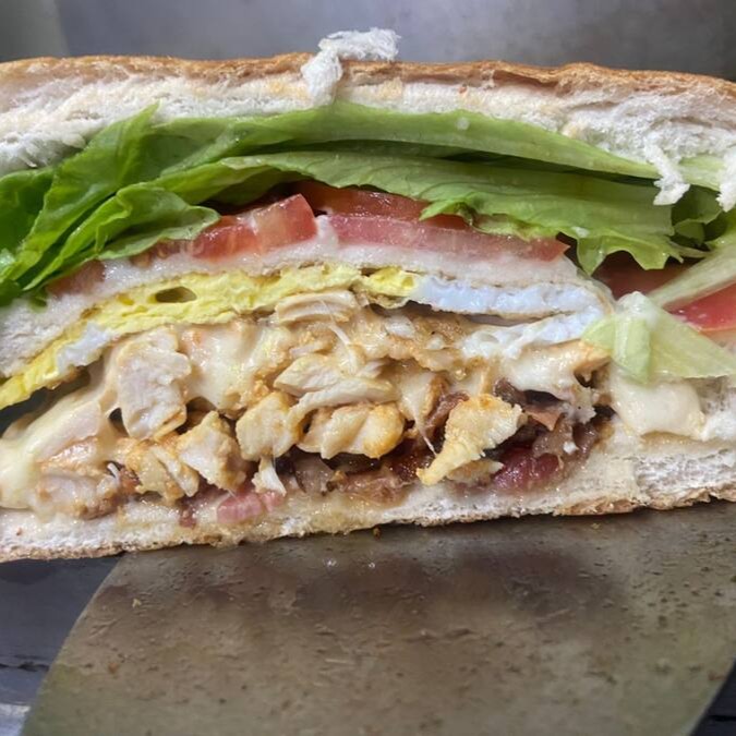 Pão , maionese , Filé de frango, queijo , ovo , bacon, alface e tomate