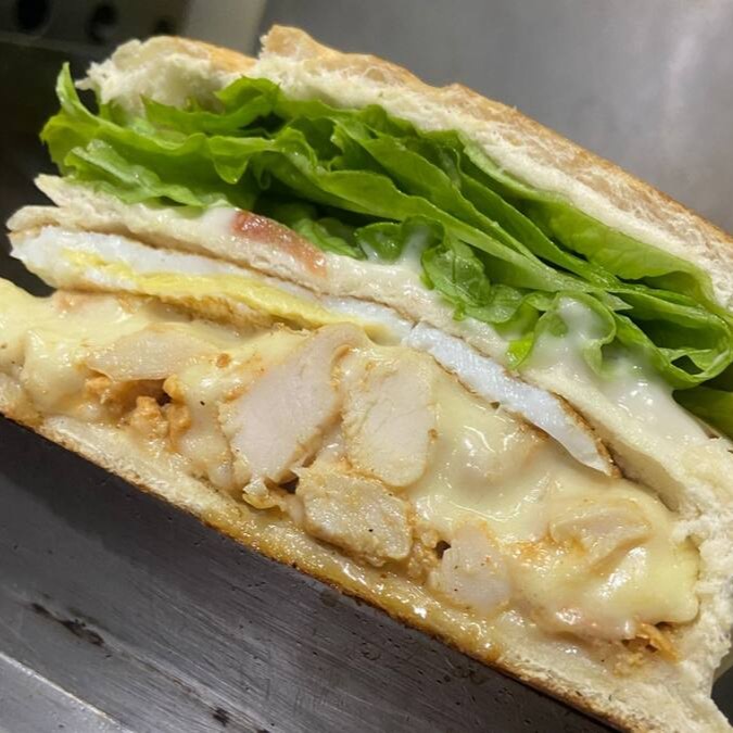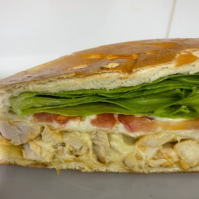 Pão , maionese, Filé de frango , queijo , calabresa, alface e tomate