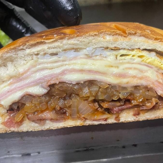 Pão, maionese, Presunto, queijo, bacon, ovo e cebola top