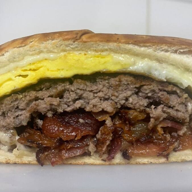 Pão , maionese, hambúrguer , queijo ,calabresa e ovo