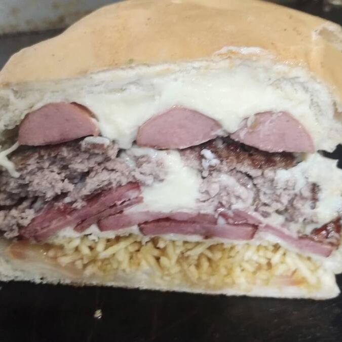 Pão,Maionese, Hambúrguer, queijo, calabresa, Catupiry Original, salsicha, batata palha e tomate