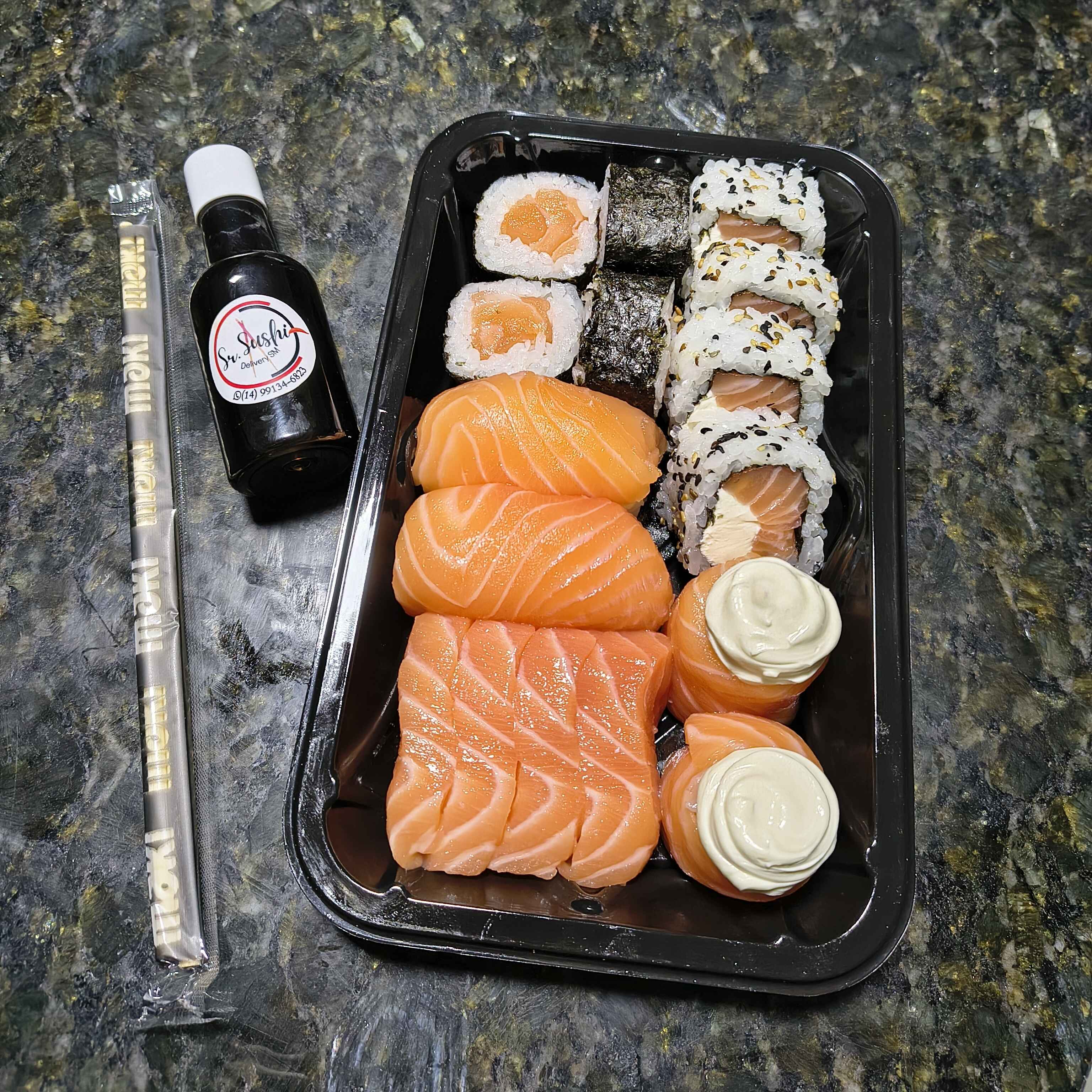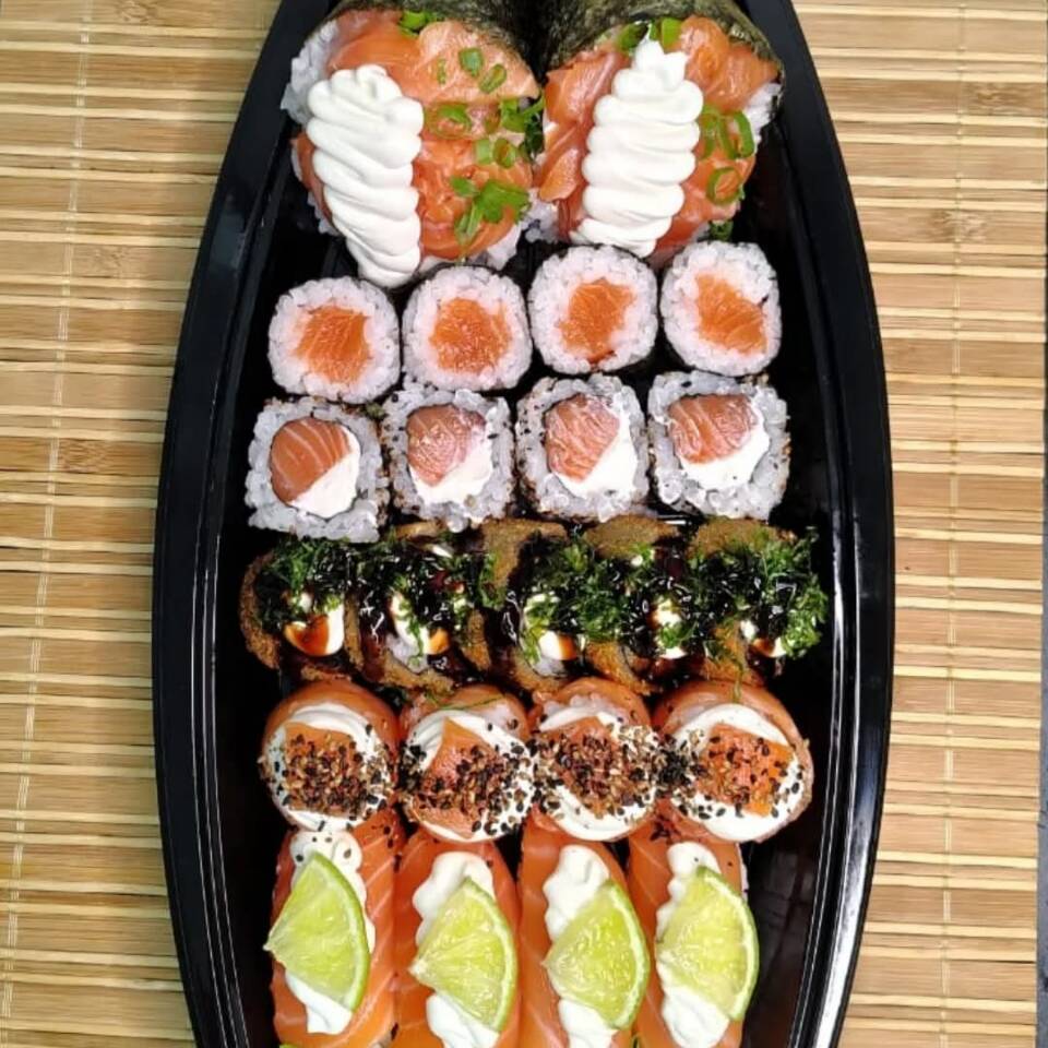 12 hossomaki de salmão 12 uramaki de salmão 10 sashimis de salmão 12 joy de salmão 12 niguiri de salmão