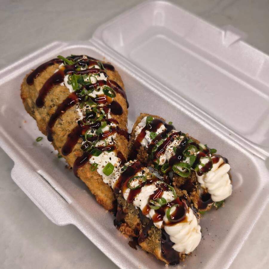 Arroz japonês, salmão grelhado, cream cheese e cebolinha ( empanado e frito)