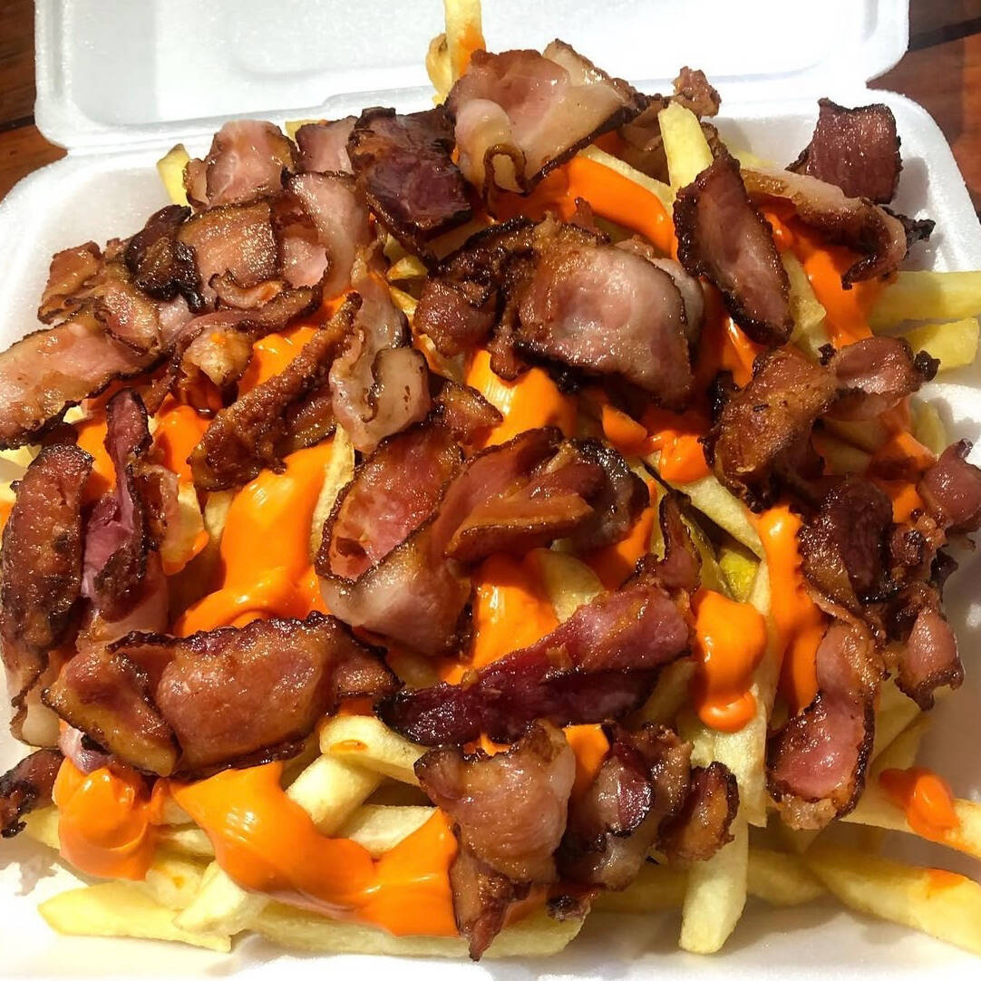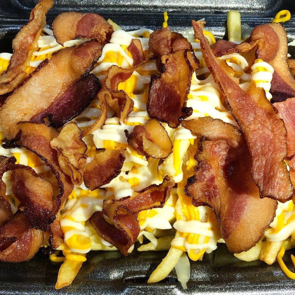 Batata palito frita c/ queijo mussarela, cheddar cremoso e requeijão catupiry + bacon. Acompanhada de nosso suculento molho de alho.