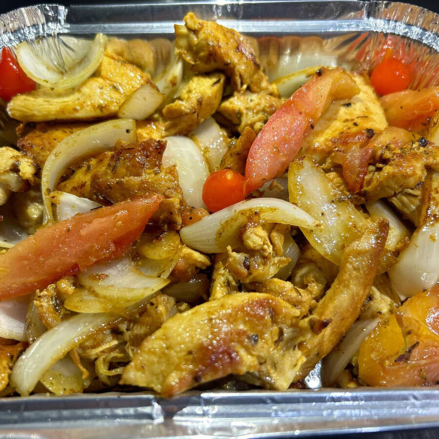Tiras de filé de frango no tacho finalizada c/ tomate e cebola acompanhada de nosso suculento molho de alho.