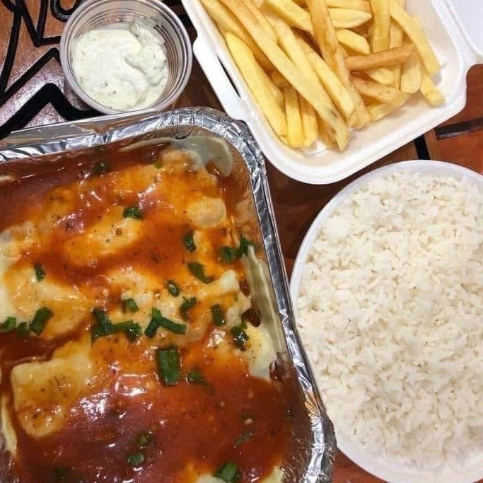 Deliciosos file de tilápia empanada com um irresistível molho de tomate caseiro, acompanhada com fritas nosso delicioso arroz branco e nosso suculento molho de alho. Servindo 2 pessoas