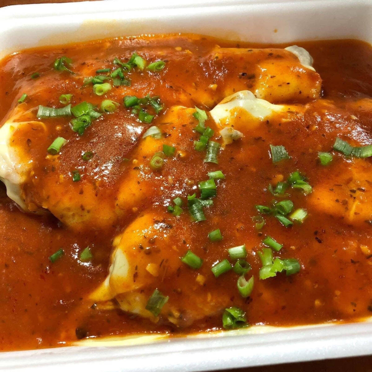 Frango a parmegiana individual com aquele molho de tomate caseiro irresistível acompanhada de nosso delicioso arroz branco, fritas e nosso suculento molho de alho.