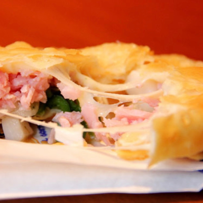 Pastel recheado c/Presunto, queijo mussarela, rodelas de tomate e orégano.