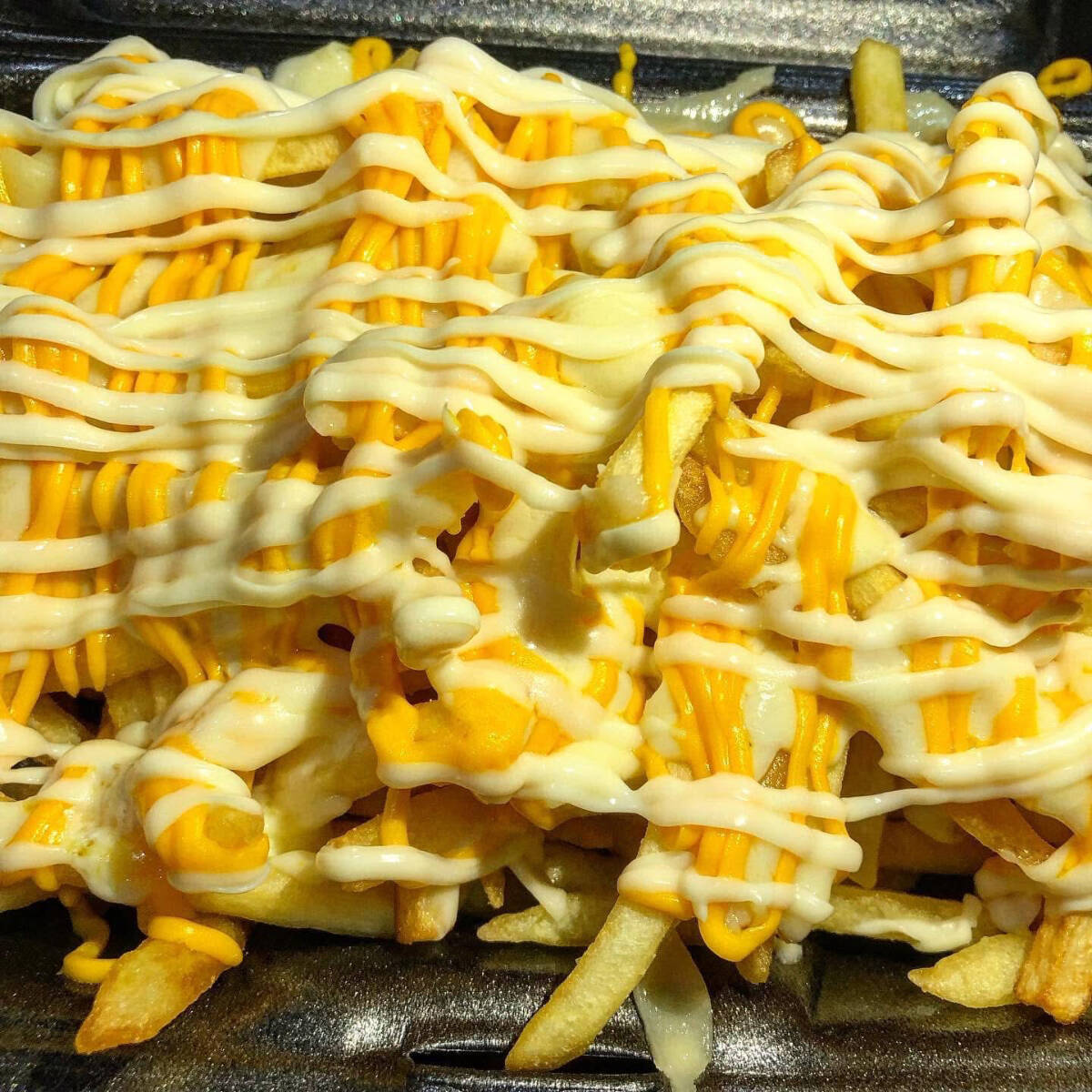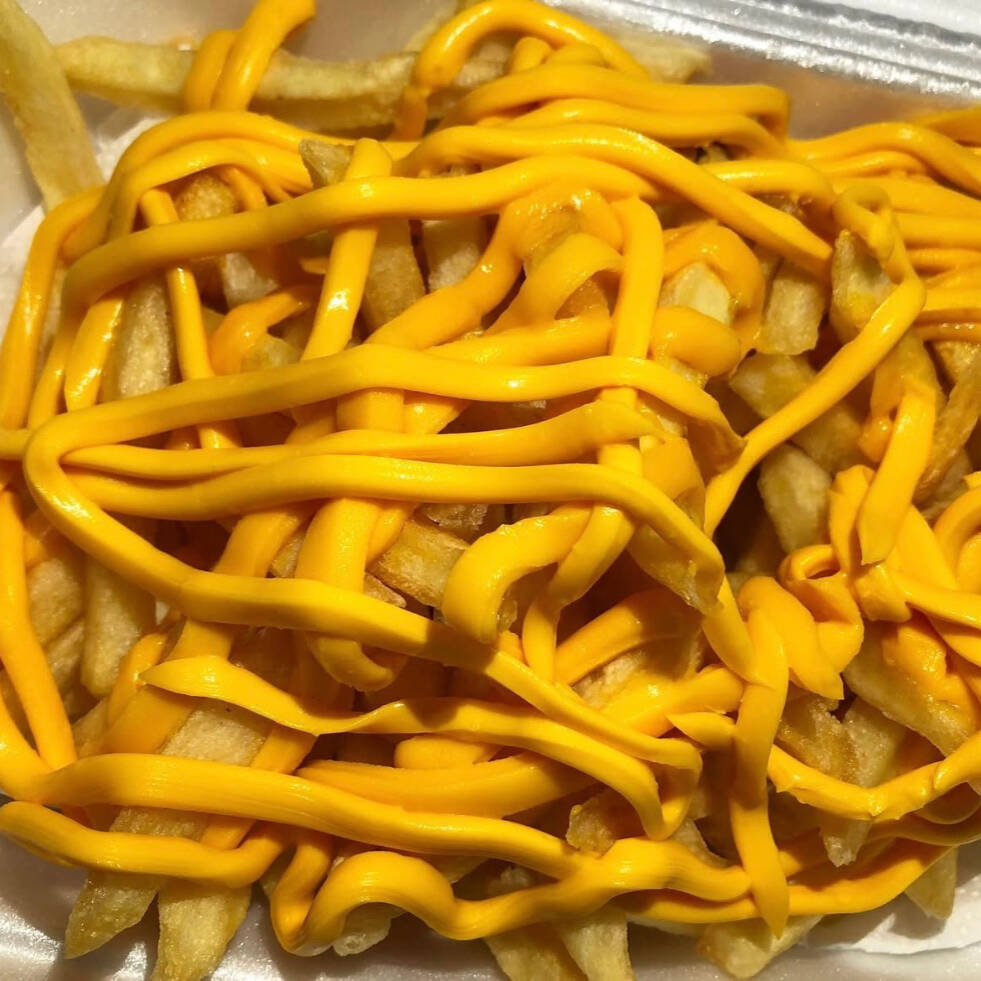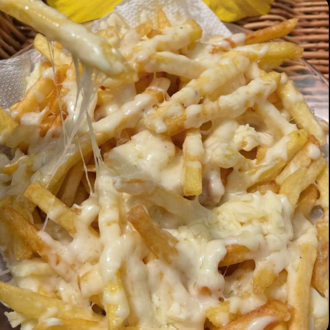Batata palito frita c/ 3 queijos. Mussarela, cheddar cremoso e requeijão catupiry.