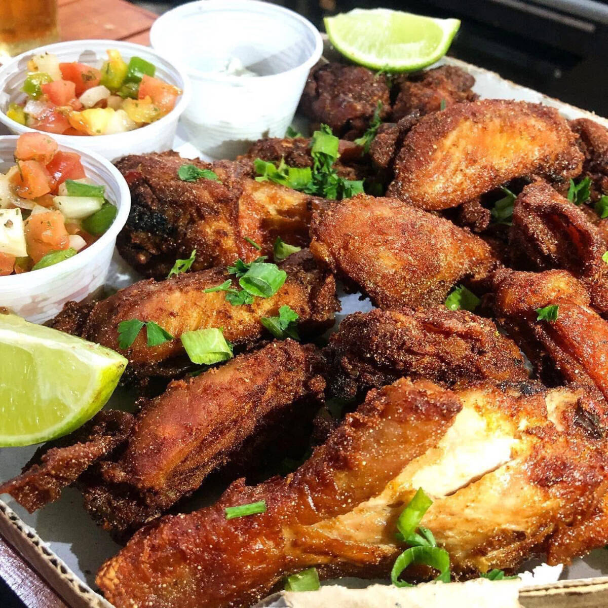 deliciosos pedaços de coxa sobre coxa suculento e crocante, acompanhado de nosso delicioso arroz branco e molho de alho.