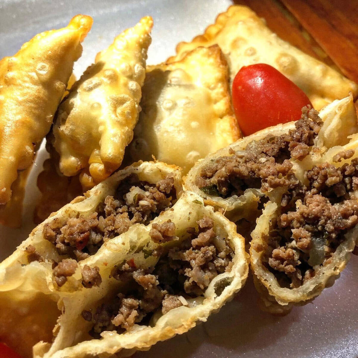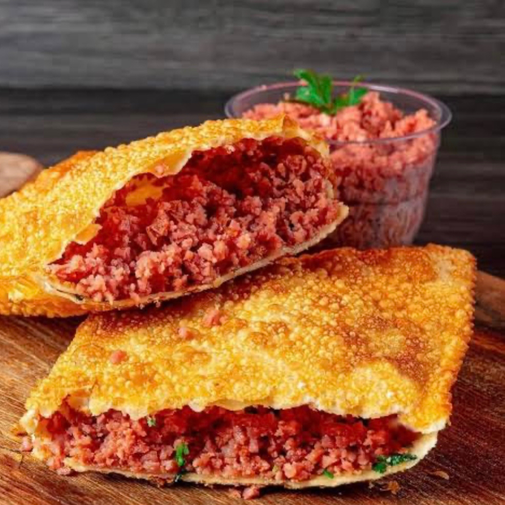 Porção de mini pastéis de carne moída, carne temperada com especiarias selecionadas. 18 unidades