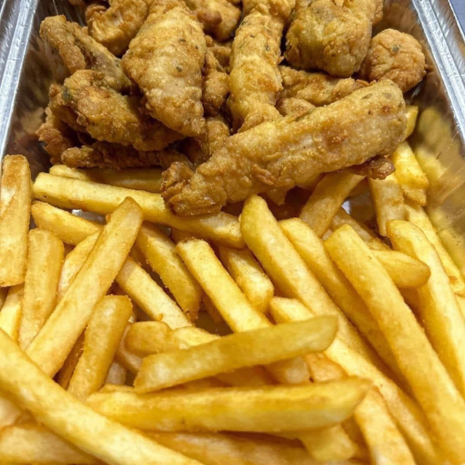 Iscas de filé de tilápia empanada c/Fritas acompanhada de arroz branco e nosso suculento molho de alho. Servindo 2 pessoas