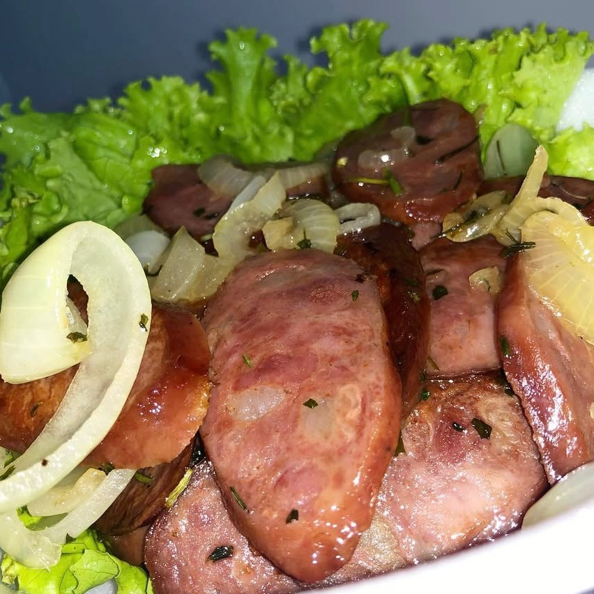 Linguiça calabresa acebolada acompanhada de nosso saboroso arroz branco e nosso suculento molho de alho.