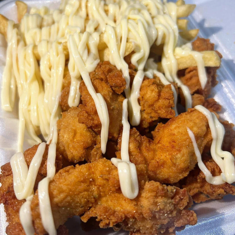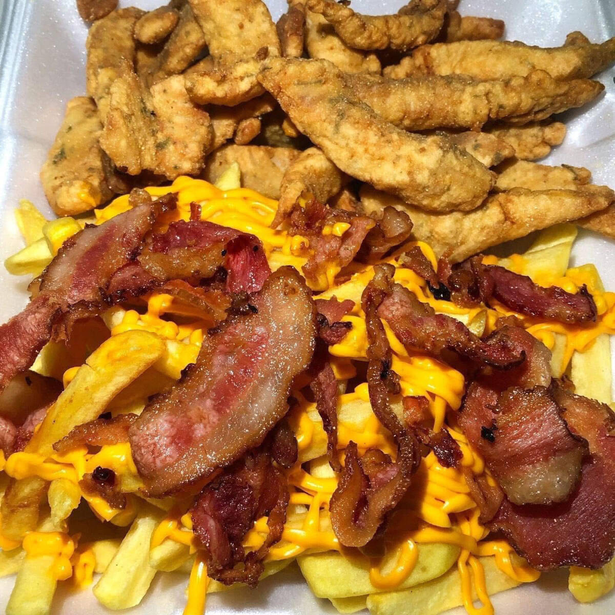 Iscas de filé de tilápia empanada c/Fritas bacon e cheddar cremoso, acompanhada de nosso delicioso arroz branco e nosso saboroso molho de alho. Servindo 2 pessoas