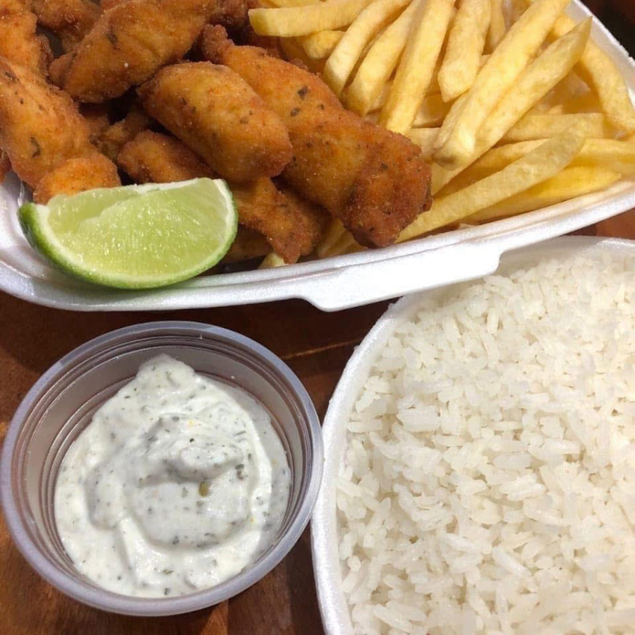 Iscas de filé de tilapia empanada acompanhada de arroz branco e nosso suculento molho de alho.