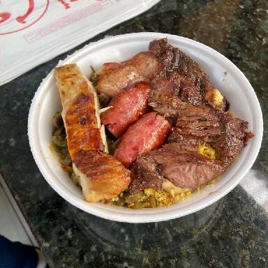 Acompanha arroz, feijao, farofa, batata frita, linguica, panceta, frango e 4 fatias de carnes.