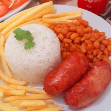 Arroz, feijão, farofa, refogado, batata frita e linguiça