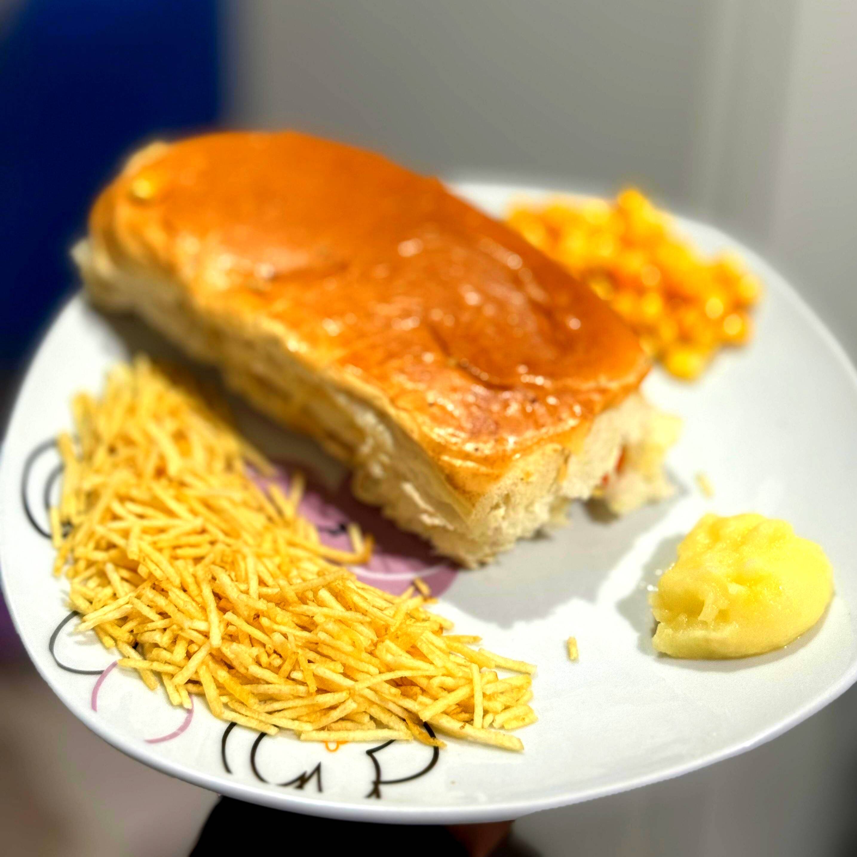 Hamburguer, mussarela, presunto, maionese, ketchup, mostarda, milho e batata palha.