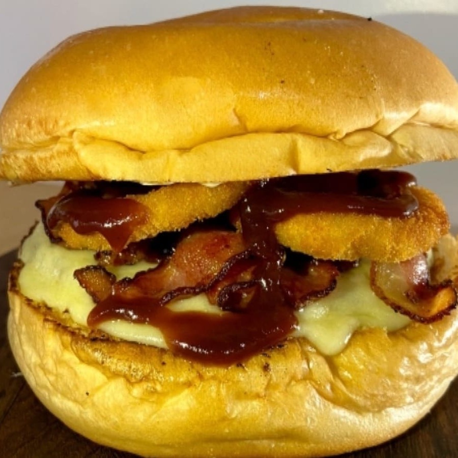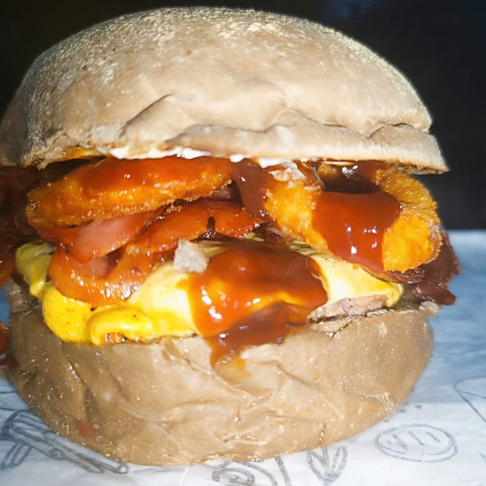 pão australiano, 2 blends da casa 120g cada, queijo prato em dobro, onion rings, molho barbecue e maionese