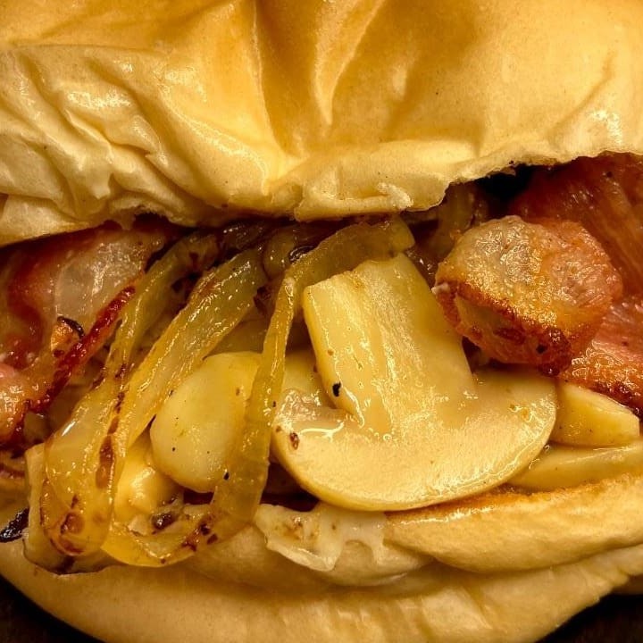 Hamburger 120g, mussarela, champignons, cebola chapeada, bacon e maonese