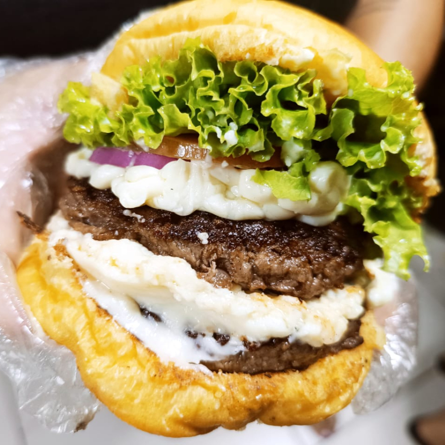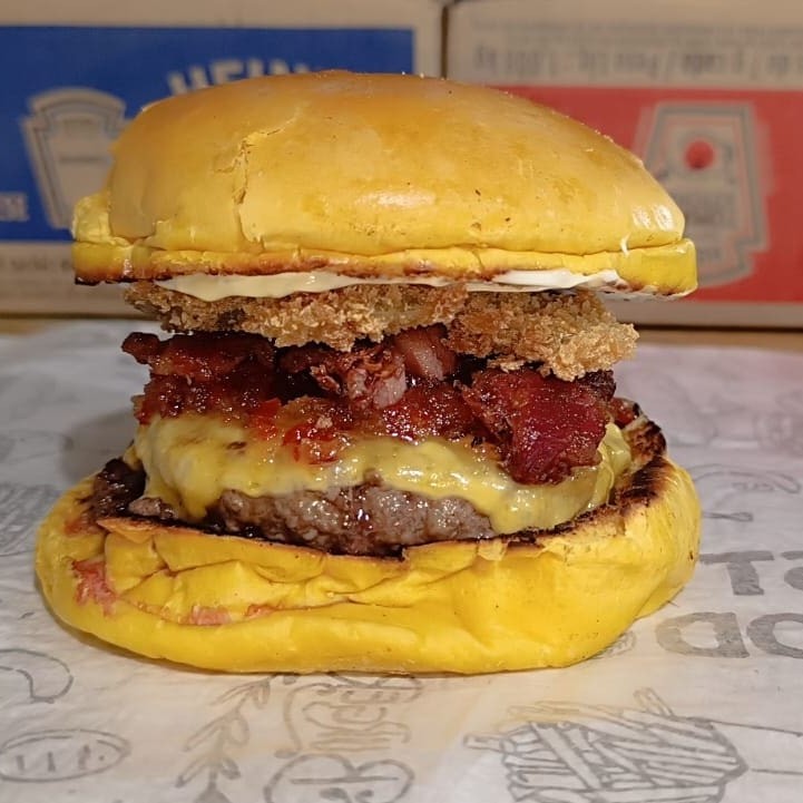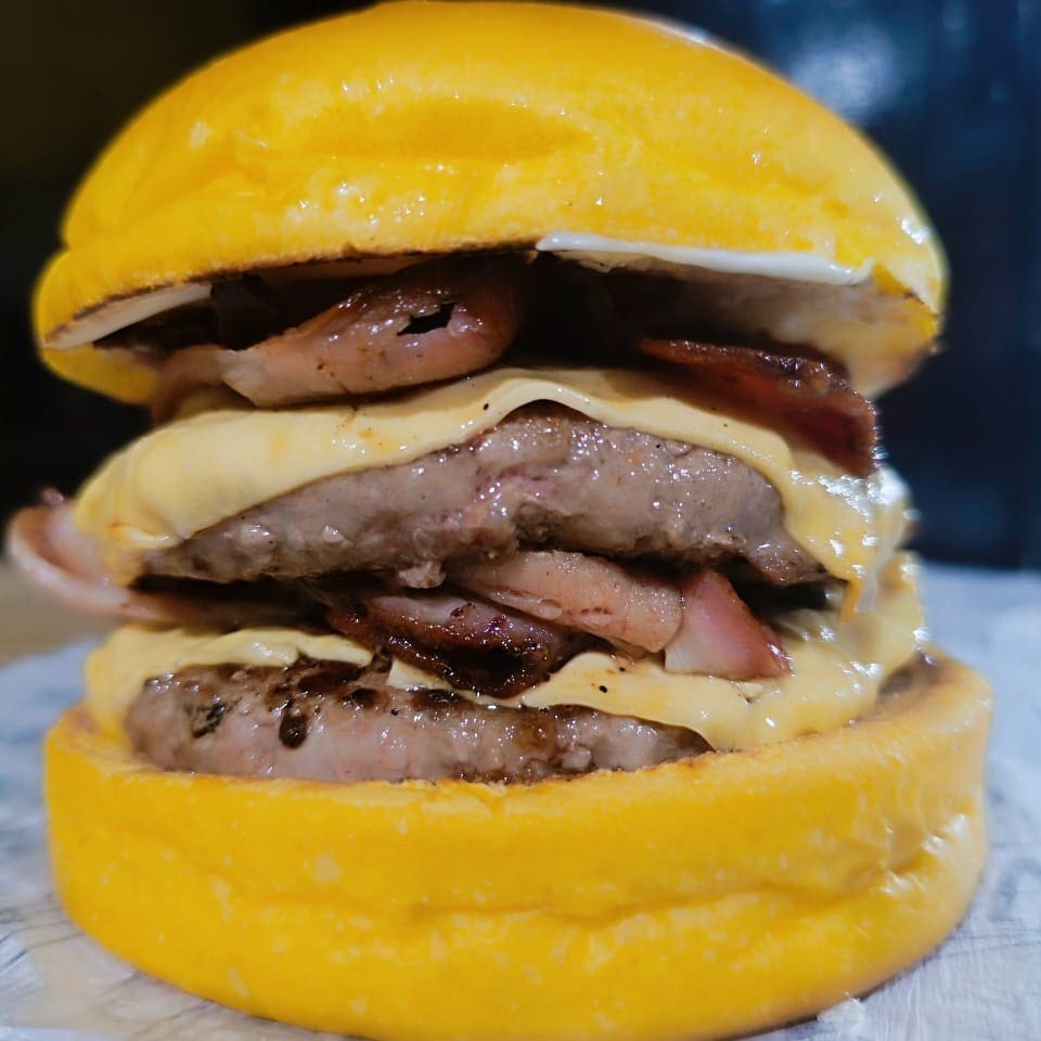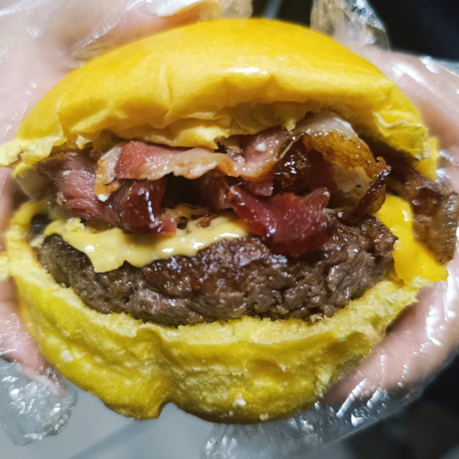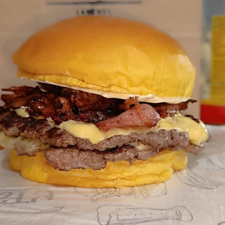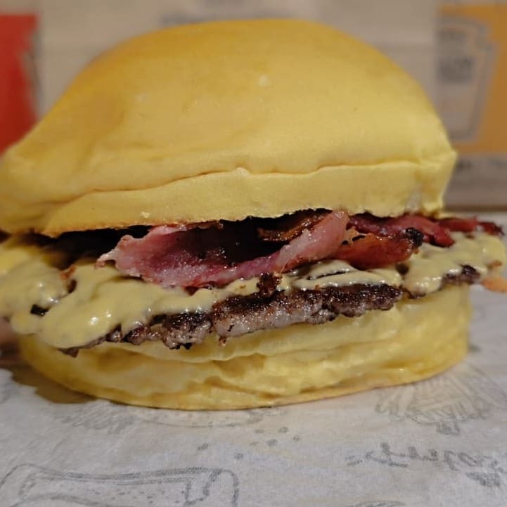 Pão brioche, 2 blends da casa 120g cada prensado na chapa, queijo prato em dobro, bacon em dobro e maionese
