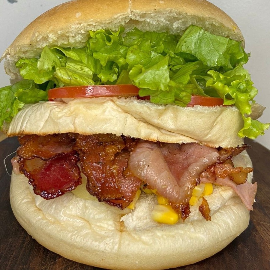 Hamburger 90g, presunto, mussarela, milho, bacon, alface, tomate e maionese