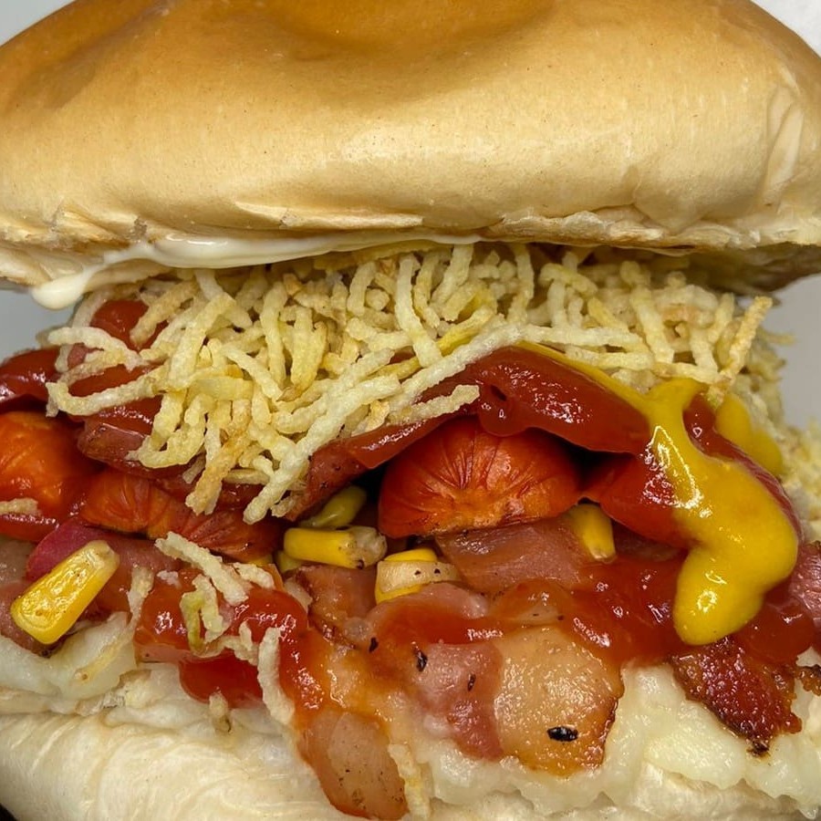 2 salsichas, vinagrete, milho, bacon, calabresa, purê, batata palha, maionese, catchup e mostarda