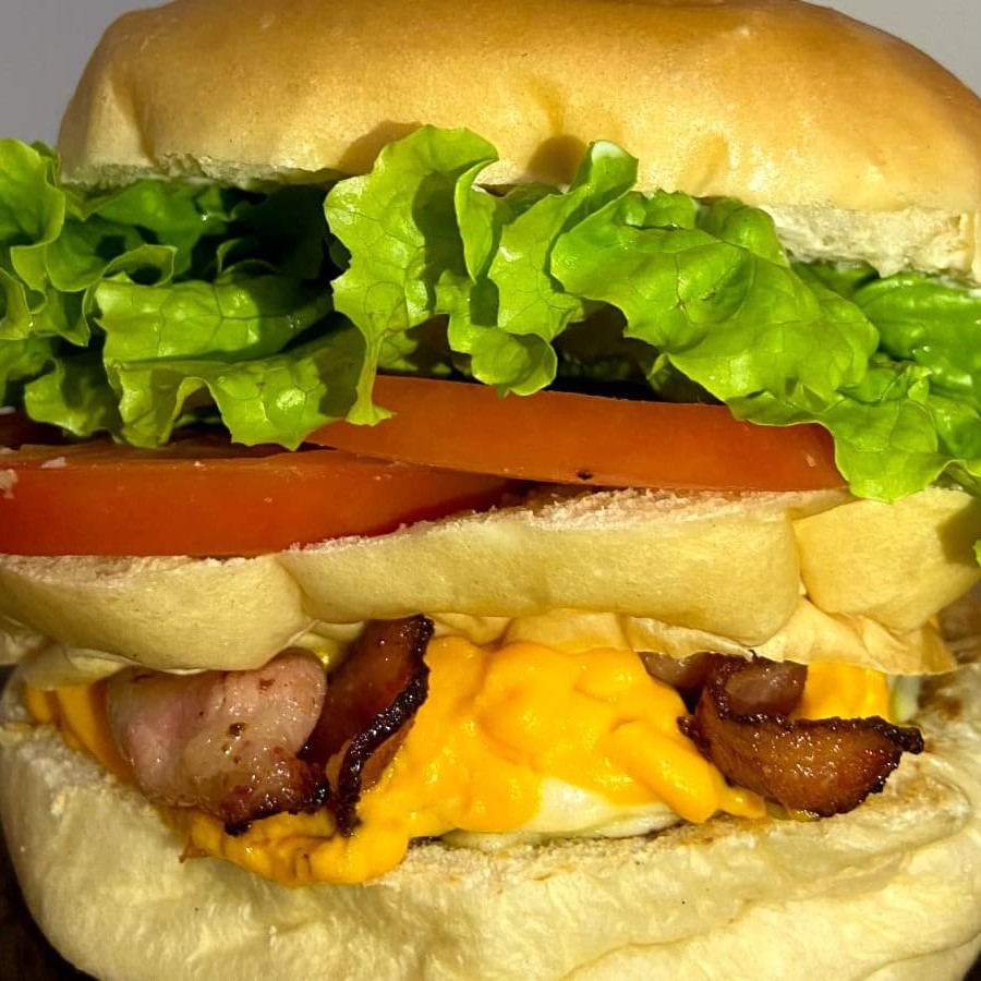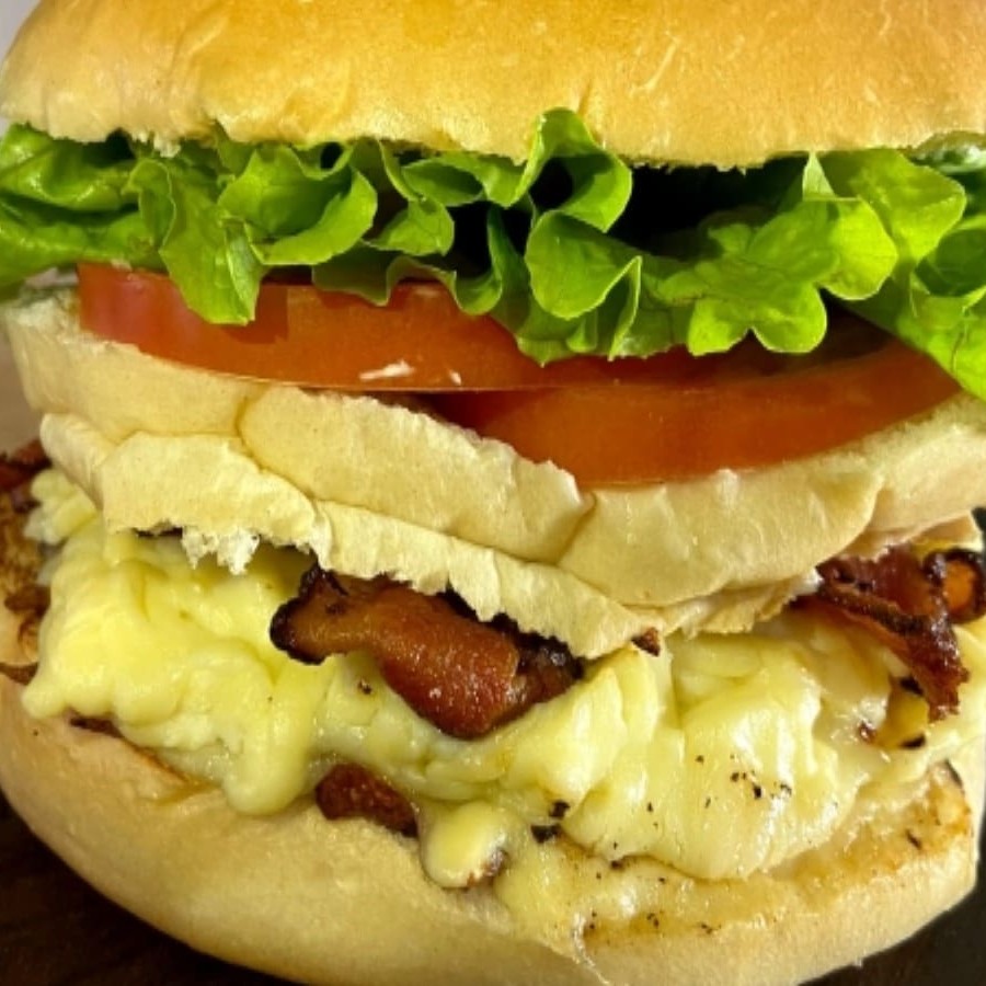 Pão brioche, blend da casa 120g prensado na chapa, queijo prato, muito bacon, alface fresquinha, tomate e maionese