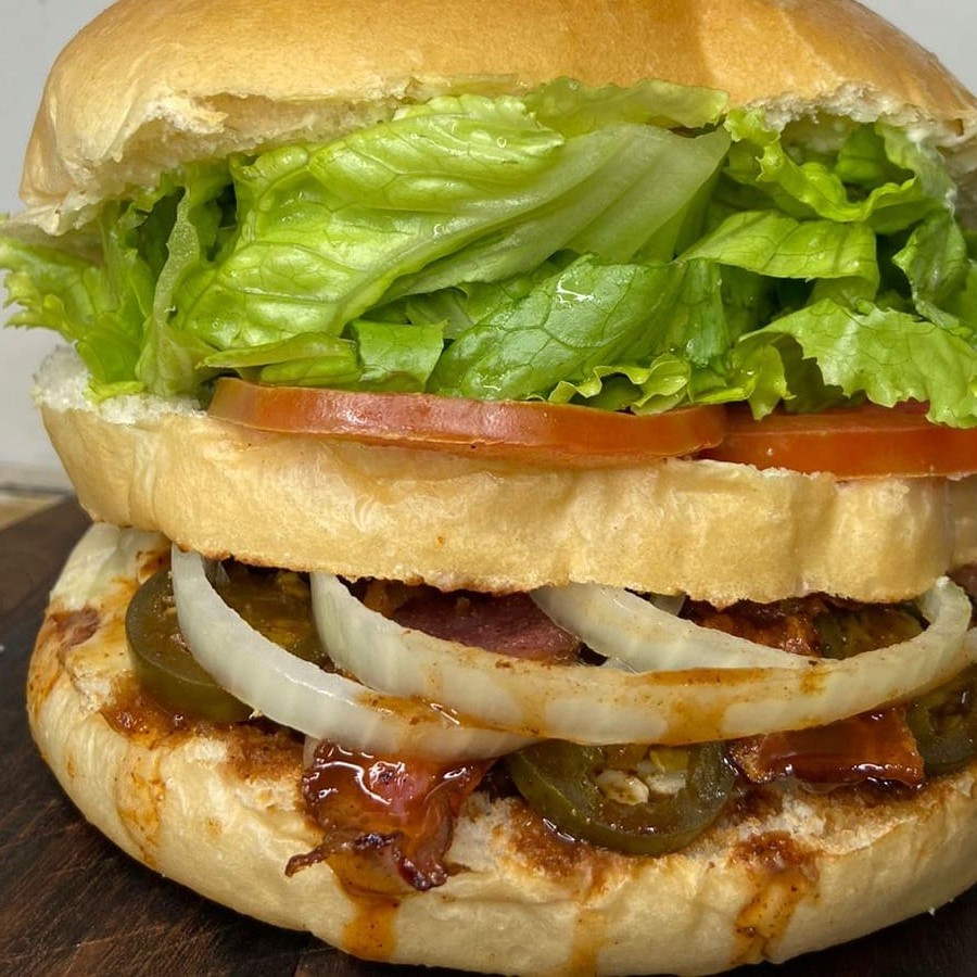 Hamburger 120g, mussarela, bacon, pimenta jalapeno, alface, tomate, cebola, molho hot e maionese