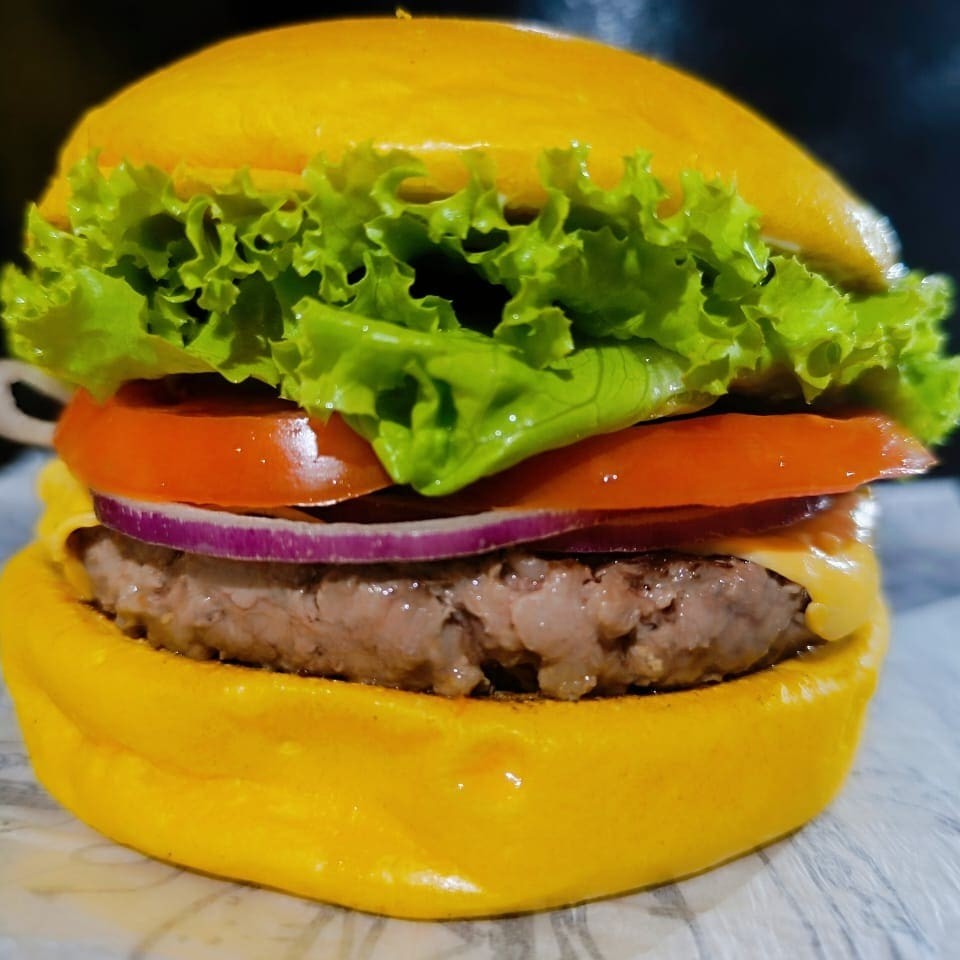 Pão Brioche, delicioso blend da casa com 180g, queijo prato, alface fresquinha, tomate, cebola roxa e maionese