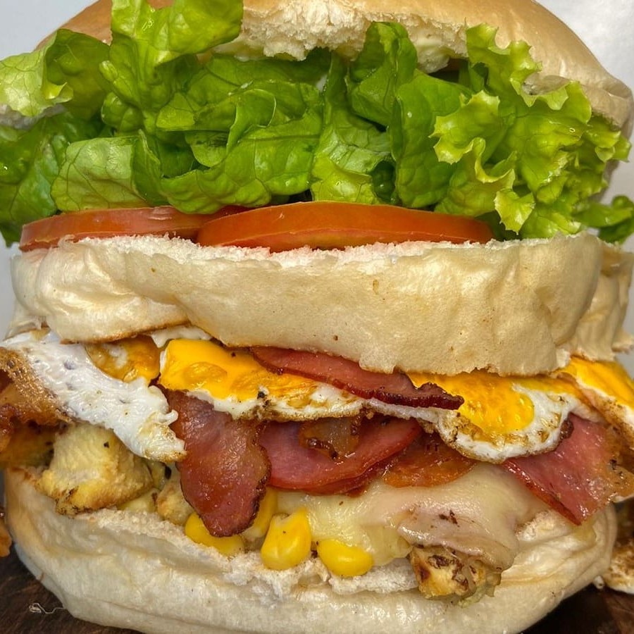 Hamburger 90g, calabresa, frango, bacon, presunto, mussarela, milho, ovo, alface, tomate e maionese
