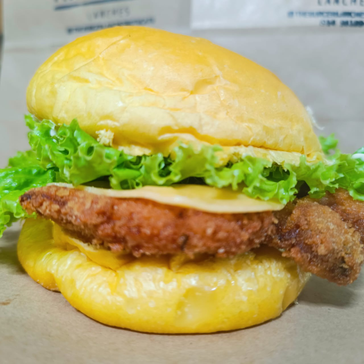 Pão brioche, filé de frango empanado, queijo prato, alface e maionese