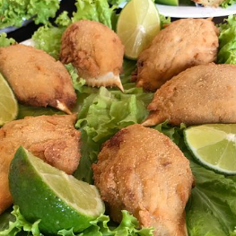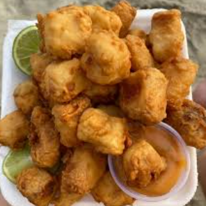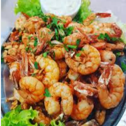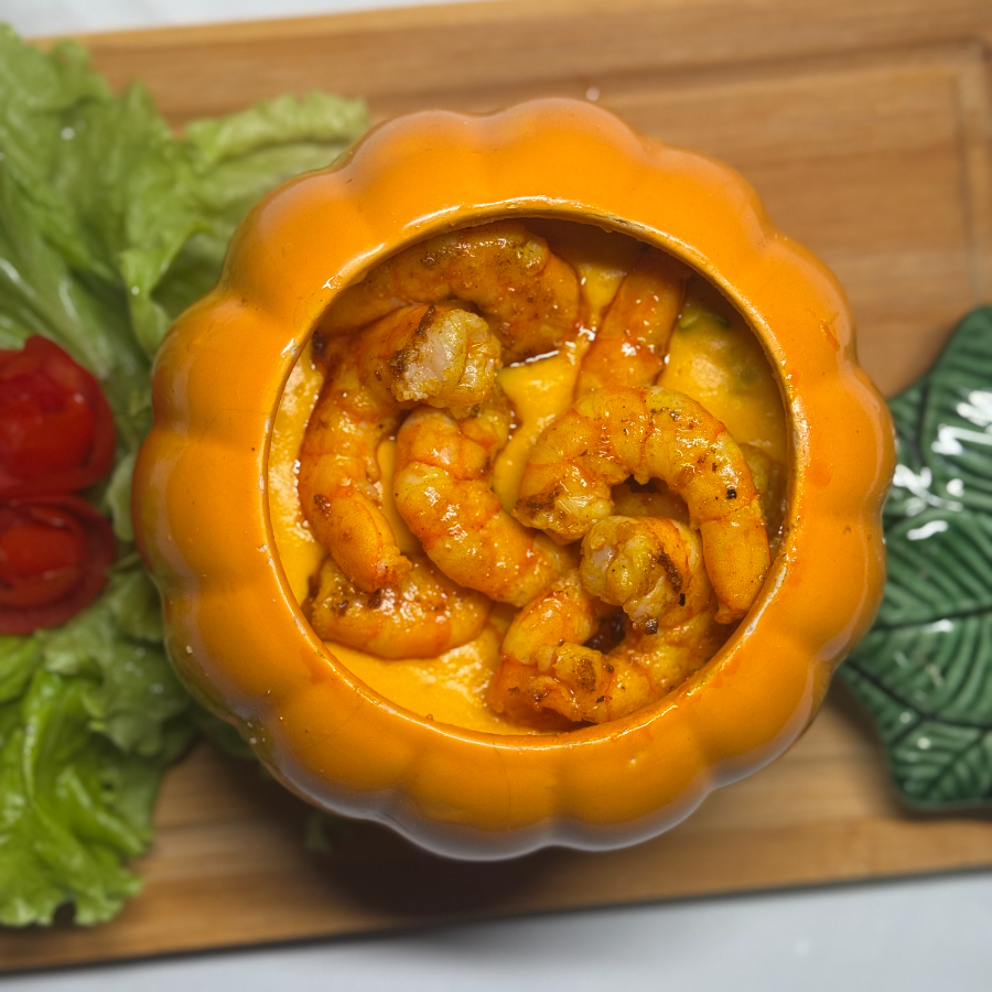 Camarão ao creme de abacaxi, arroz, fritas e salada