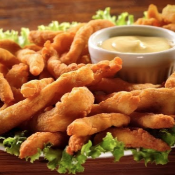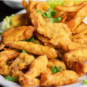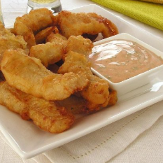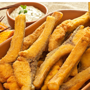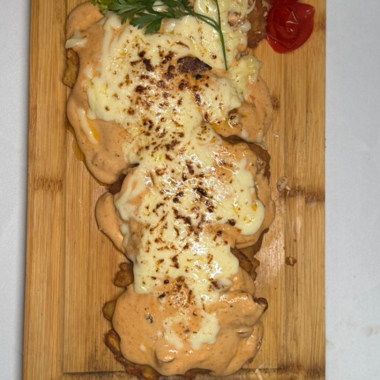 Tilapia ao molho de queijo, arroz, fritas e salada