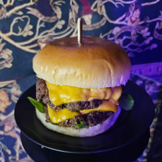 Pão de brioche, 2 Hamburguer 120gr, Rucula, Tomate Seco, Queijo Prato e Geleia de Pimenta.