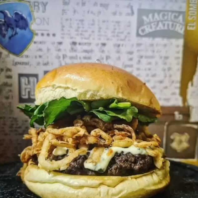 Pão de Brioche, Hamburguer 130gr, Rucula, Gorgonzola e Cebola Crispy