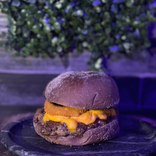 Pão Australiano, Hambuguer 120gr, Cheddar, Anel de Cebola Empanado.