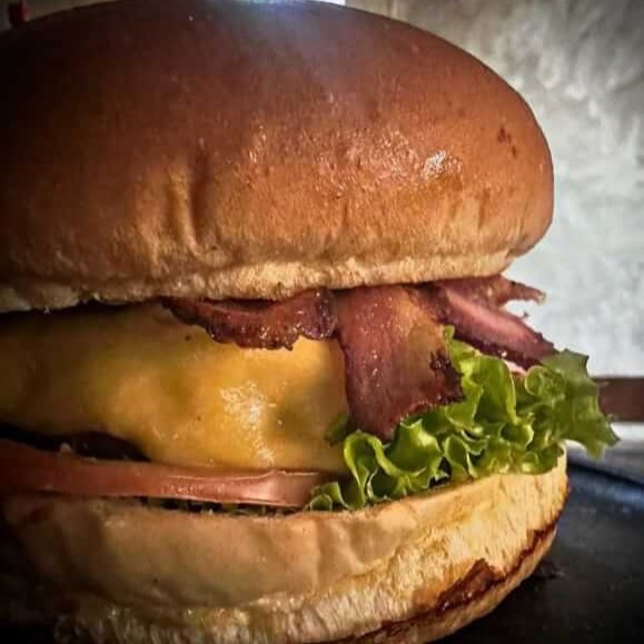 Pão de brioche, Molho da Casa, Alface, Tomate, Hamburguer 130gr, Bacon e Queijo Prato.