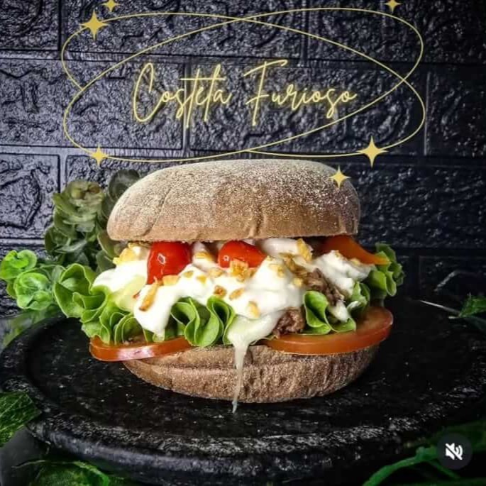 Pão Australiano, Costela Desfiada, Queijo Mussarela, Alho Frito, Alface, Tomate, Pimenta Biquinha e Crencheese