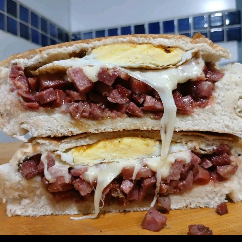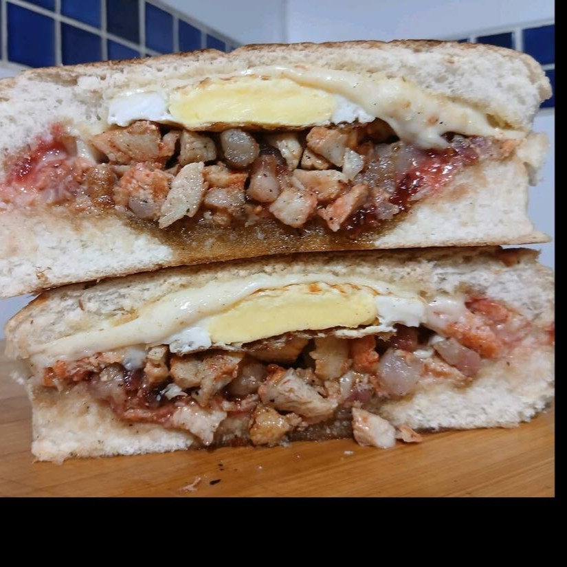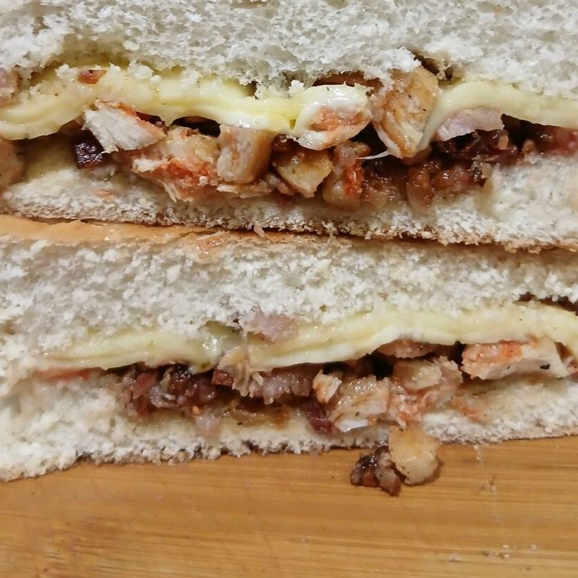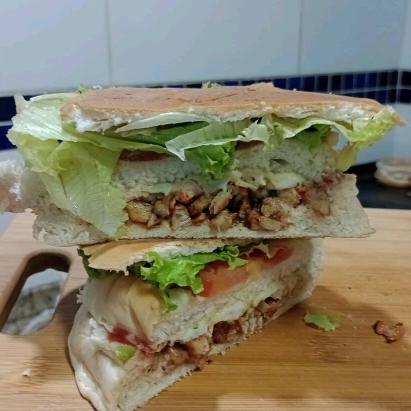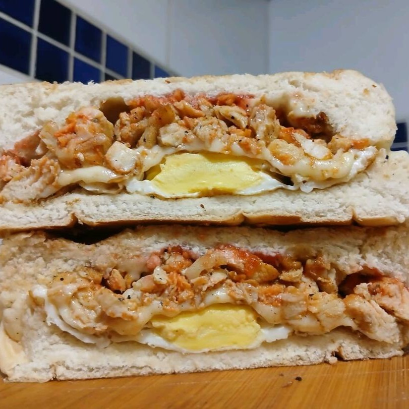 Sanduíche de frango com queijo, ovo, maionese e ketchup, uma opção deliciosa e nutritiva para qualquer hora.