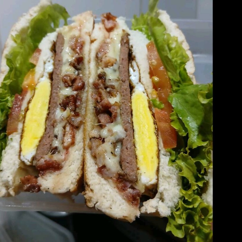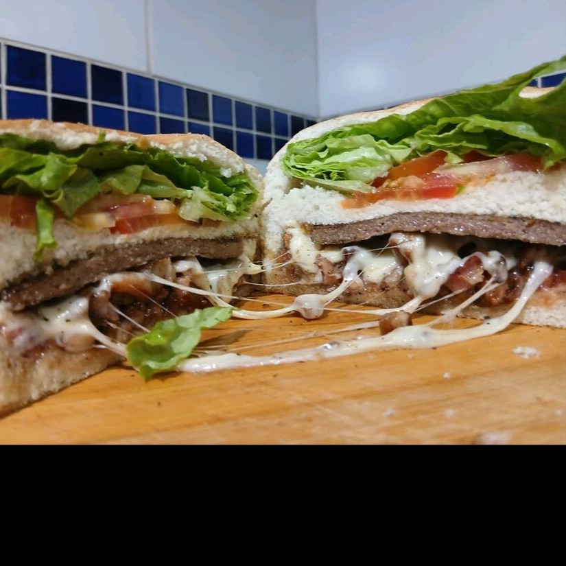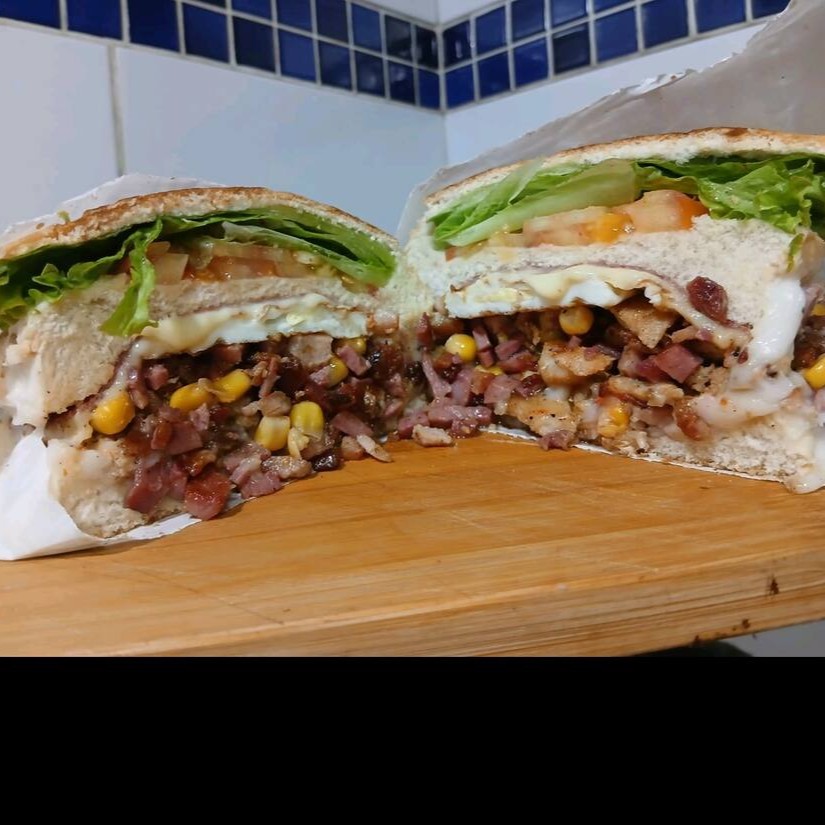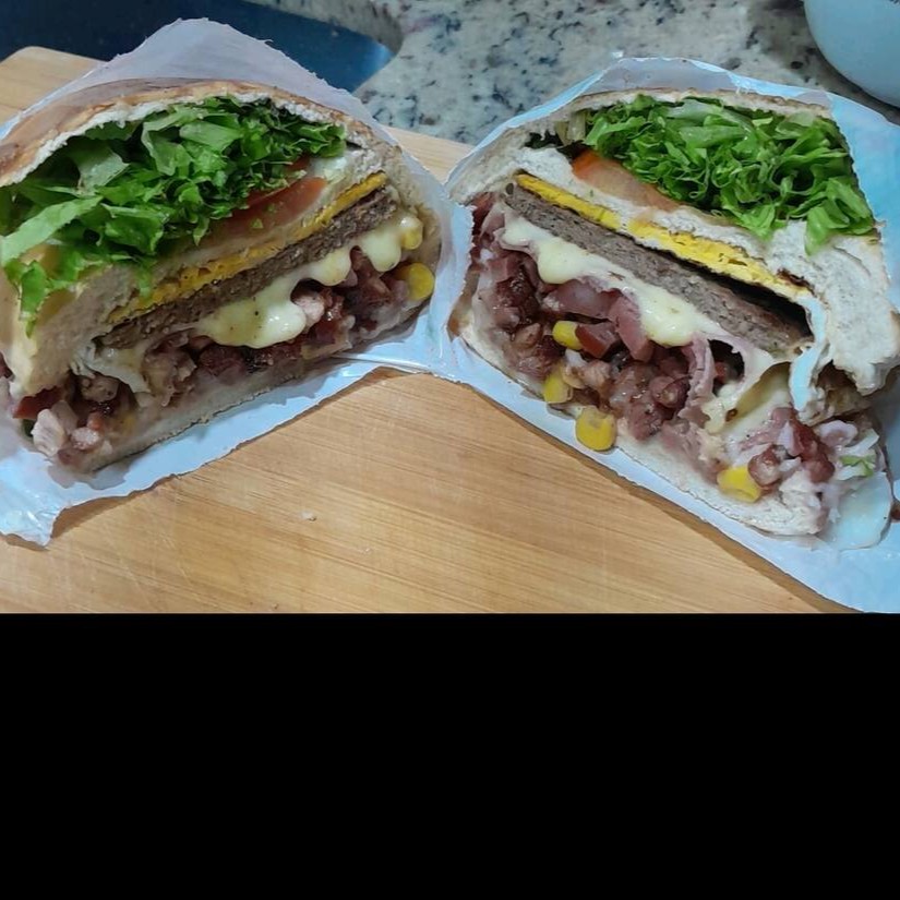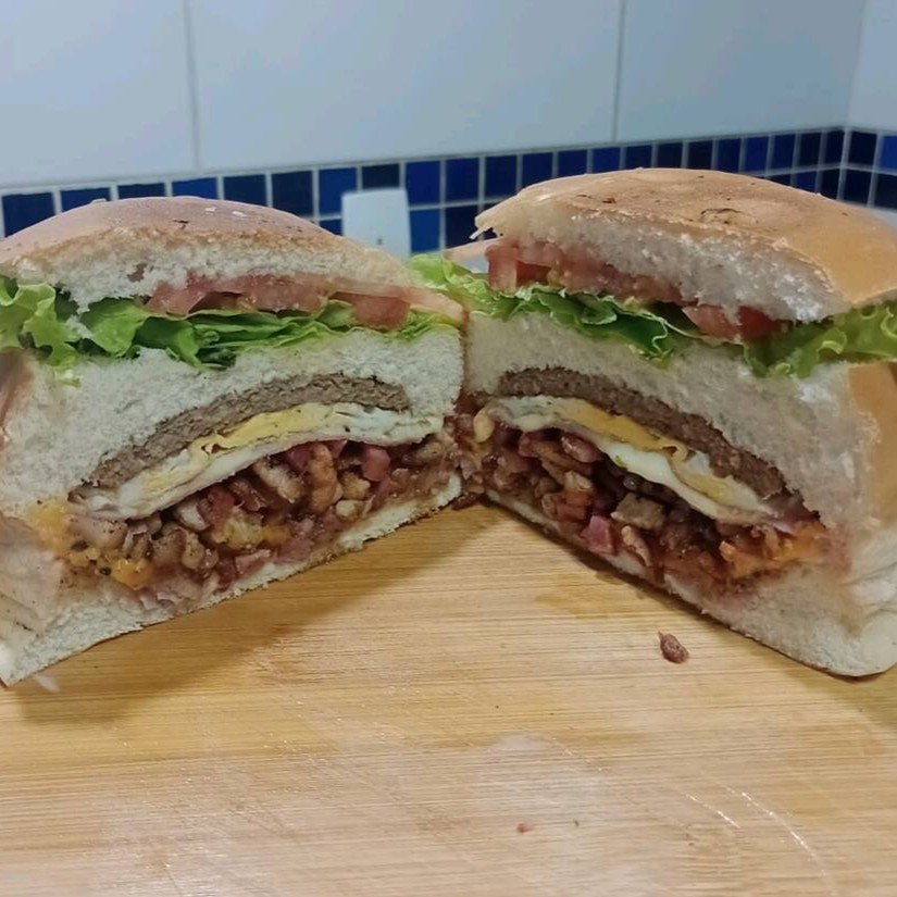 Hambúrguer com queijo, ovo, bacon, calabresa, Catupiry, milho, presunto, maionese e ketchup, uma explosão de sabores. Acompanha molho de alho verde