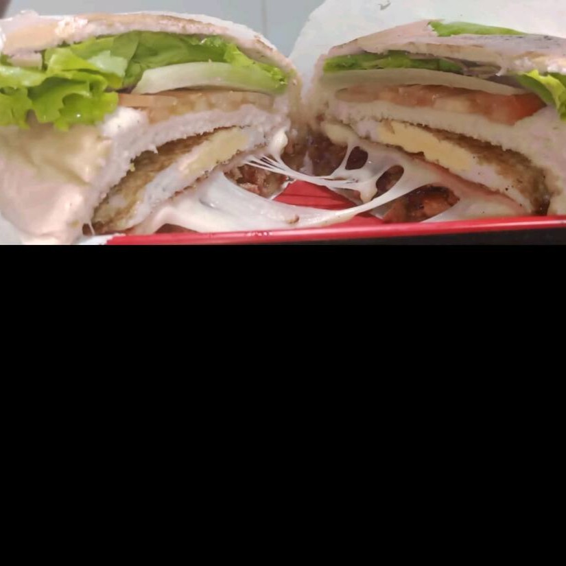 Sanduíche de frango com queijo, ovo, bacon, salada, maionese e ketchup, uma explosão de sabores e texturas. Acompanha molho de alho verde