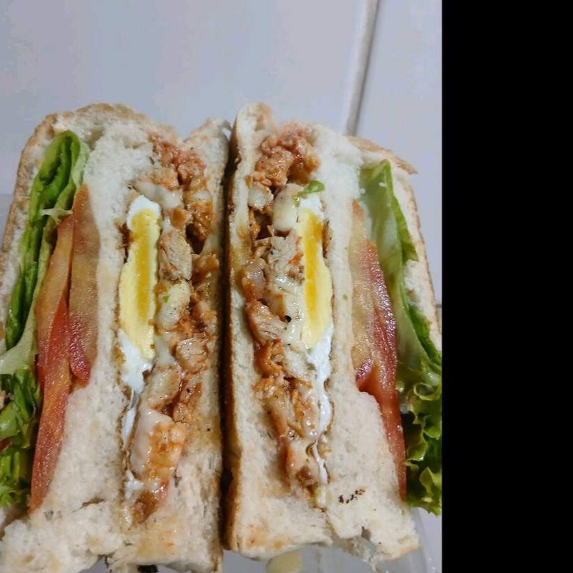 Sanduíche de frango com queijo, ovo, salada, maionese e ketchup, uma combinação saudável e saborosa. Acompanha molho de alho verde