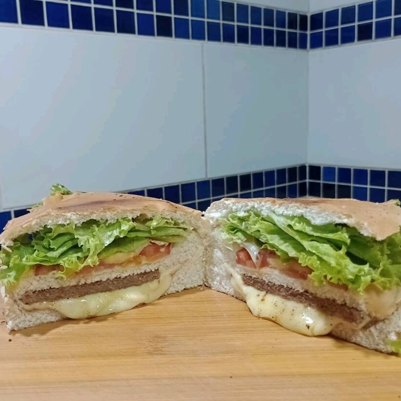 Hambúrguer com queijo, salada, ovo, maionese e ketchup, uma opção saborosa e nutritiva para qualquer hora. Acompanha molho de alho verde
