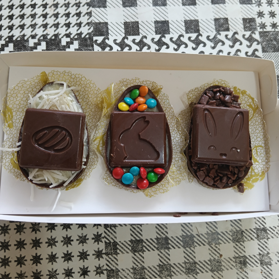 Caixinha c 3 mini ovinhos de 50 gr cada..recheio: brigadeiro,ninho c Nutella e beijinho