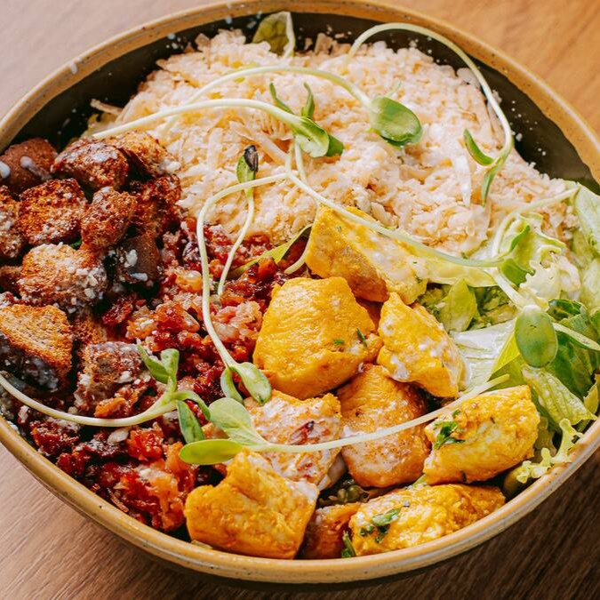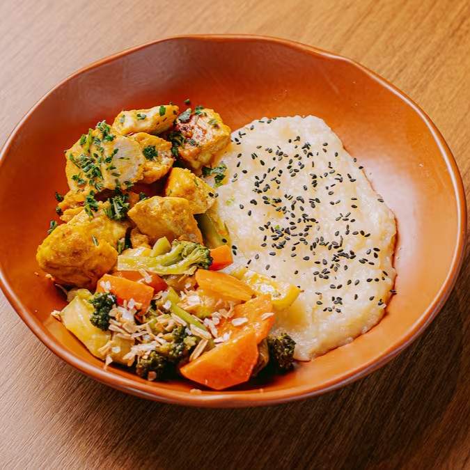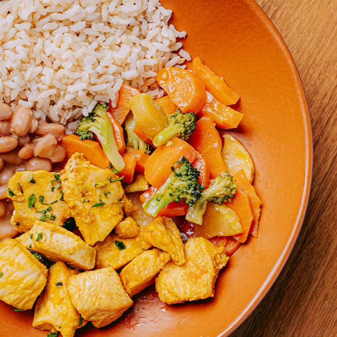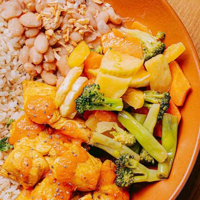 Cubos de frango grelhado com arroz integral, feijão, legumes assados e molho picante. Prato completo com fibras, ferro, vitaminas e sabor marcante que fortalece e nutre.