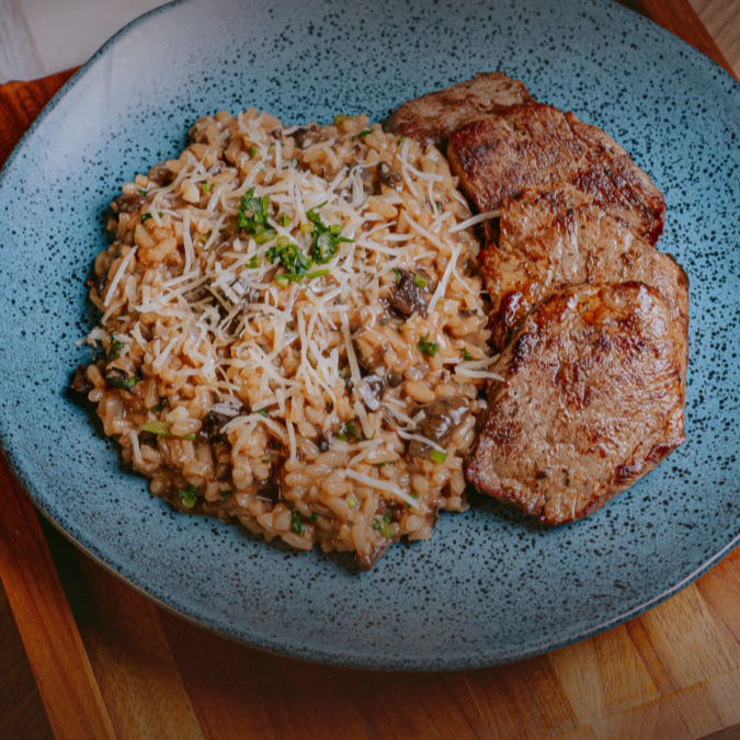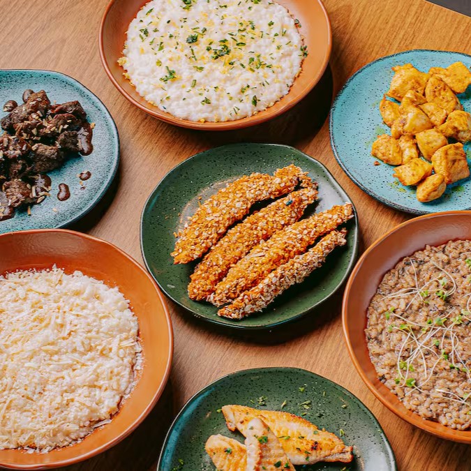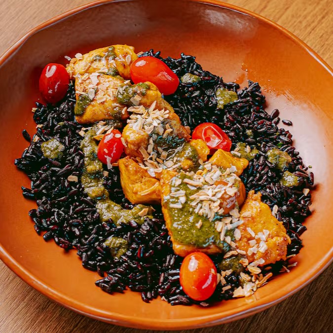 Cubos de frango grelhado com arroz negro, tomate confit, molho pesto e cebola crispy. Prato leve, colorido e cheio de sabor. Ideal para quem busca algo sofisticado. Peça já!