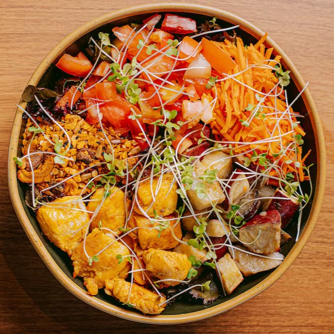 Cubos de frango grelhado com batata doce assada, cenoura, tomate cereja, mix de folhas, cebola crispy e molho de iogurte. Refrescante, nutritiva e cheia de textura. Peça agora!